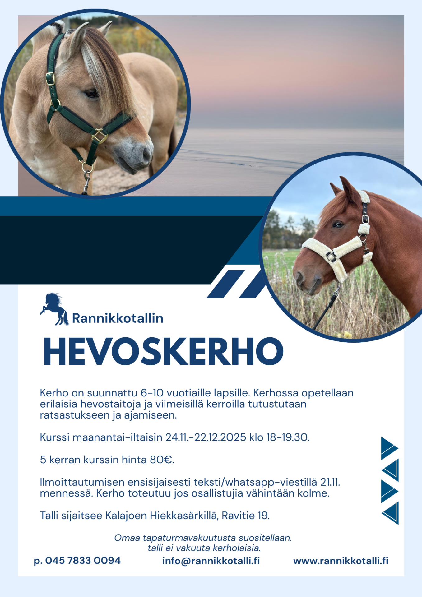 Rannikkotalli tarjoaa ratsastustunteja ja -valmennusta ja tallipaikkoja Kalajoen Hiekkasärkillä. Tavoitteenamme on tarjota laadukasta ja monipuolista ratsastustoimintaa kaikenikäisille harrastajille.